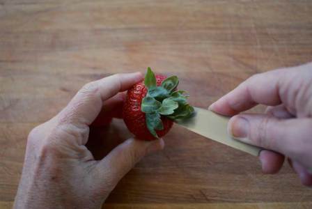 Strawberries should be hulled for freezing or if not eating directly out of the hand. Hulling involves removing the inedible green cap by placing a knife tip under the green cap and slowly turning. Once you have made a full circle you can then just pull off the cap and a small amount of white part which is attached to the base of the stem of the strawberry. There is also a strawberry hull (see below) that you can purchase to do the same task but the knife should work just as well. Strawberries can also be frozen and stored in the freezer for up to 6 months. It is best to freeze them in a single layer before placing them in containers for freezing.