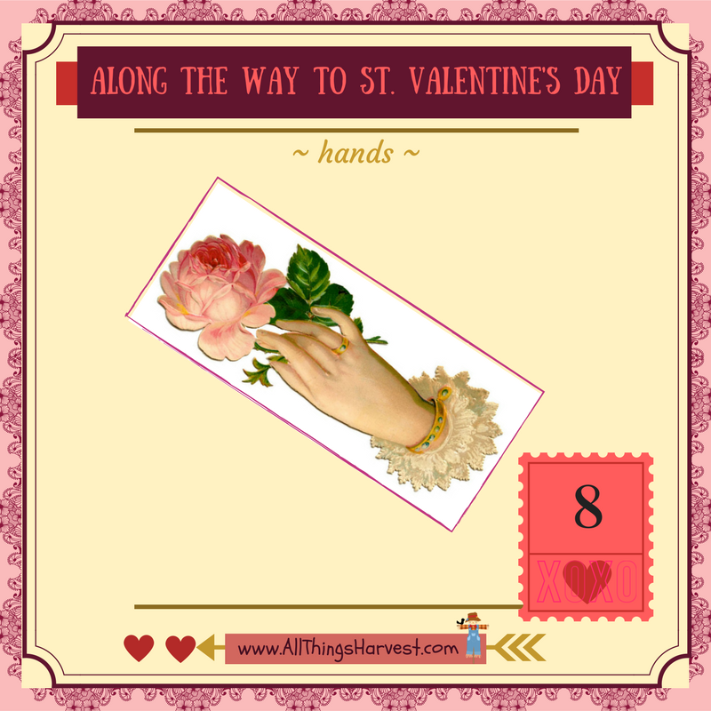 Paper hands were a popular 19th century love St. Valentine’s Day symbol that were often given as a love token. Considered a symbol of courtship as a man would propose by asking a lady for her hand, the lady’s hand appeared on both handmade and printed Valentines. A lady’s hand also symbolized femininity and as such was often decorated with a frilly cuff and a ring on the third finger.